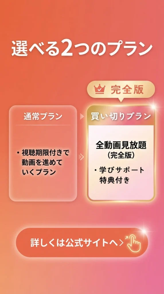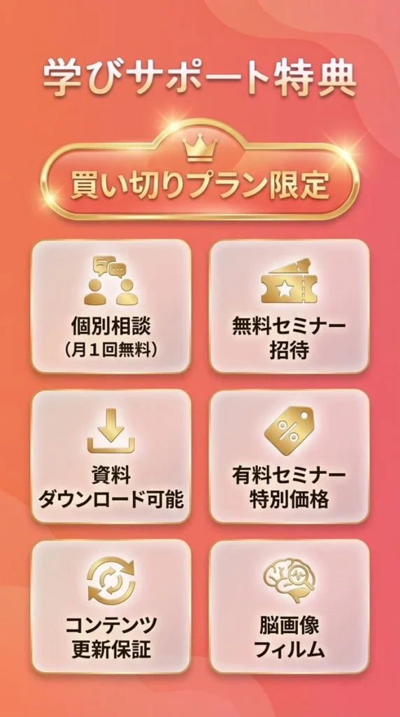 買い切りプランは、動画を見るときだけに限らず、動画視聴後も学びやすいようにサポートする「学びサポート特典」がついています。