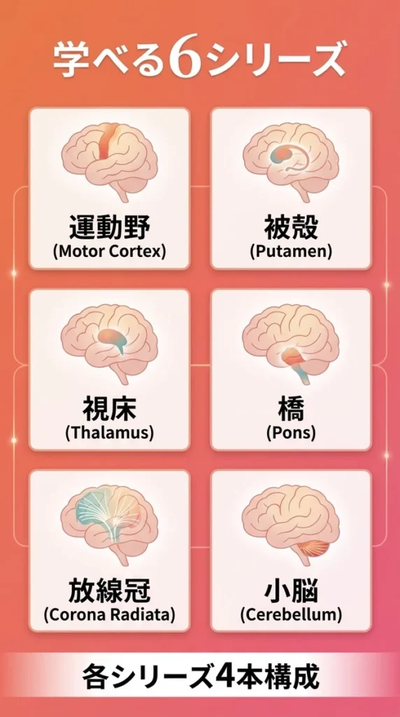 登竜門の本編では、臨床でよく出会う「運動野」「被殻」「視床」「橋」「放線冠」「小脳」について解説しています。