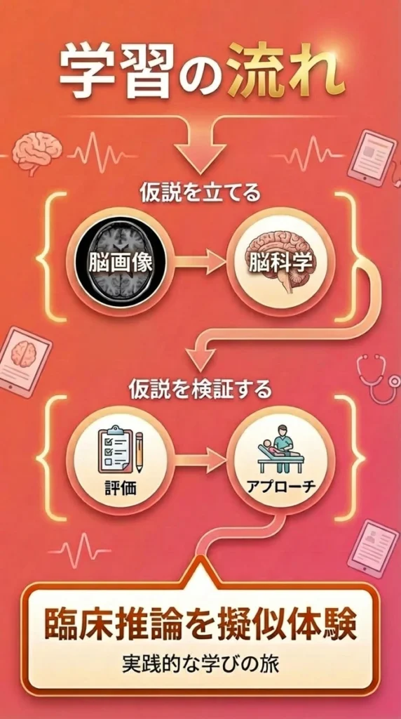 さらに内容は「脳画像」「脳科学」「評価」「アプローチ」と。臨床推論の過程を擬似的に体験しながら、考え方を学んでいく構成となっています!