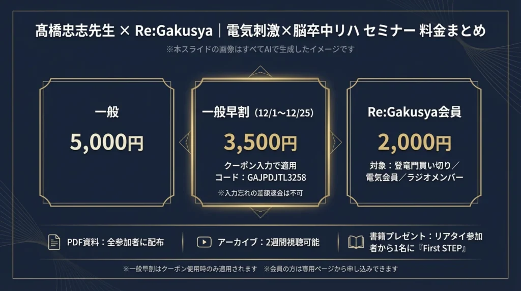 - 【参加費】一般(1/8|20:00まで):5000円、一般早割(12/1〜12/25):3500円、Re:Gakusya会員:2000円